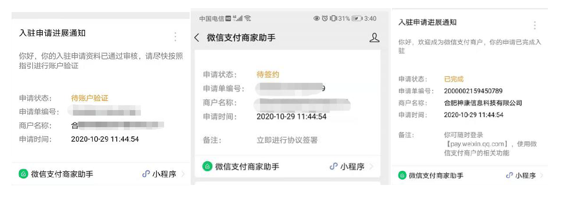 扫码进入“微信支付商家助手”公众号,接收到“入驻申请进展通知”;